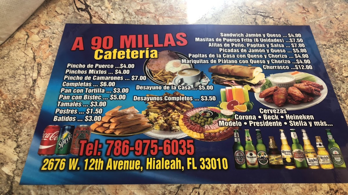 If you're looking for a spot that brings a taste of Cuban-inspired comfort food, A 90 Millas Café Menu offers a selection that is sure to satisfy. Located in Hialeah, FL, this local gem serves up a variety of flavorful dishes that capture the essence of authentic Cuban cuisine. Whether you're in the mood for a classic Cuban sandwich or a plate of arroz con pollo, there's something on the menu to excite your taste buds. Each dish is crafted with fresh ingredients and a lot of love, making every bite an experience you’ll want to repeat. Enjoy a warm, welcoming atmosphere while savoring your meal, whether it’s a quick lunch or a leisurely dinner. If you're in the area, be sure to stop by and explore what’s on offer.